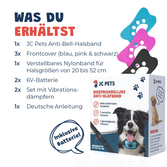 Dank des verstellbaren Halsbands, zwei Größen von Vibrationsaufsätzen und den sieben verschiedenen Empfindlichkeitsstufen ist das JC Pets Anti-Bell-Halsband für alle Hunde geeignet. Groß und klein. Außerdem wird das Anti-Bell-Halsband mit 3 Frontabdeckungen geliefert, wodurch du das Halsband nach deinen Vorlieben gestalten kannst: blau, rosa oder schwarz.