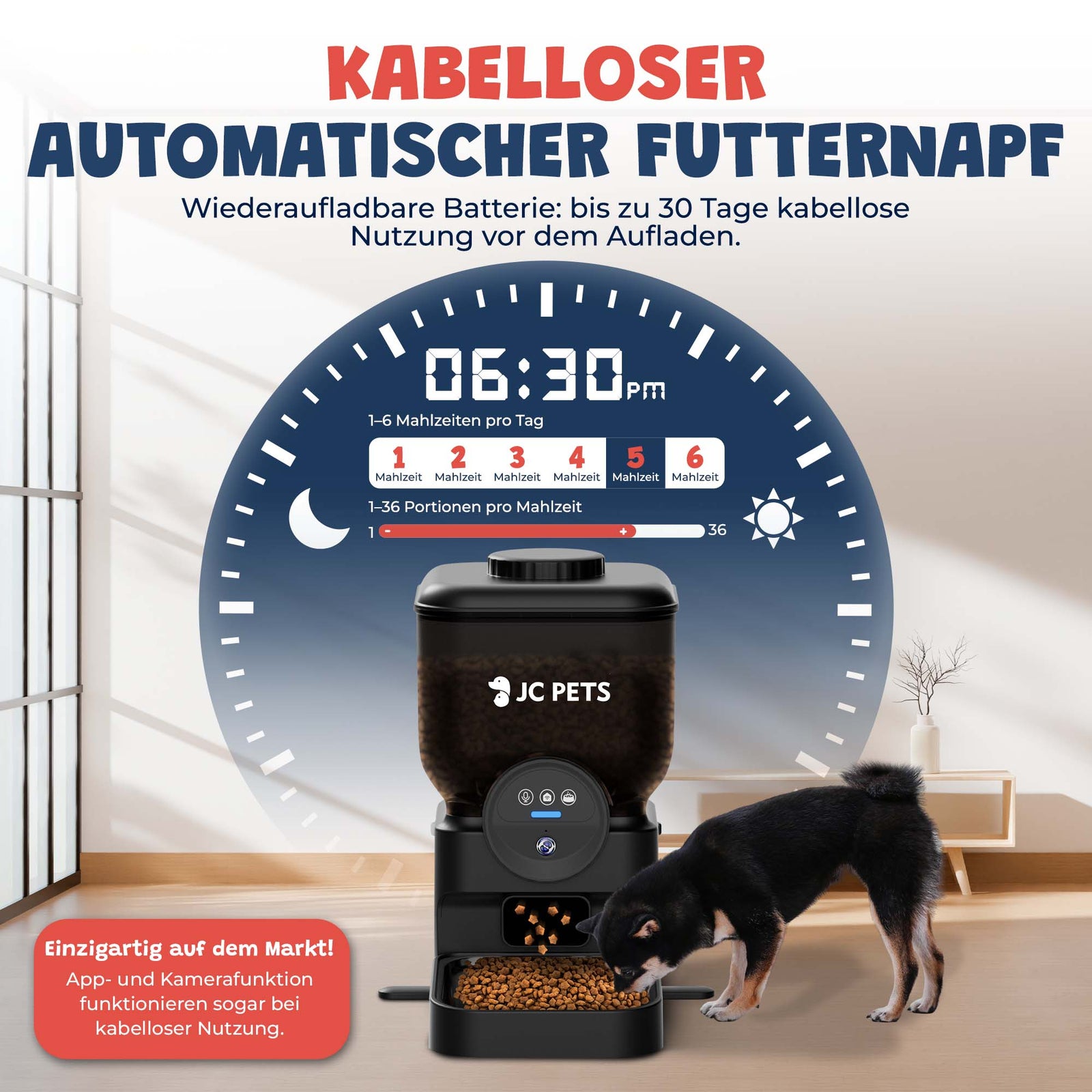 Dank des eingebauten Akkus funktioniert der Futterautomat auch bei Stromausfall. Auch die App- und Kamerafunktion bleiben im Akkubetrieb aktiv.
