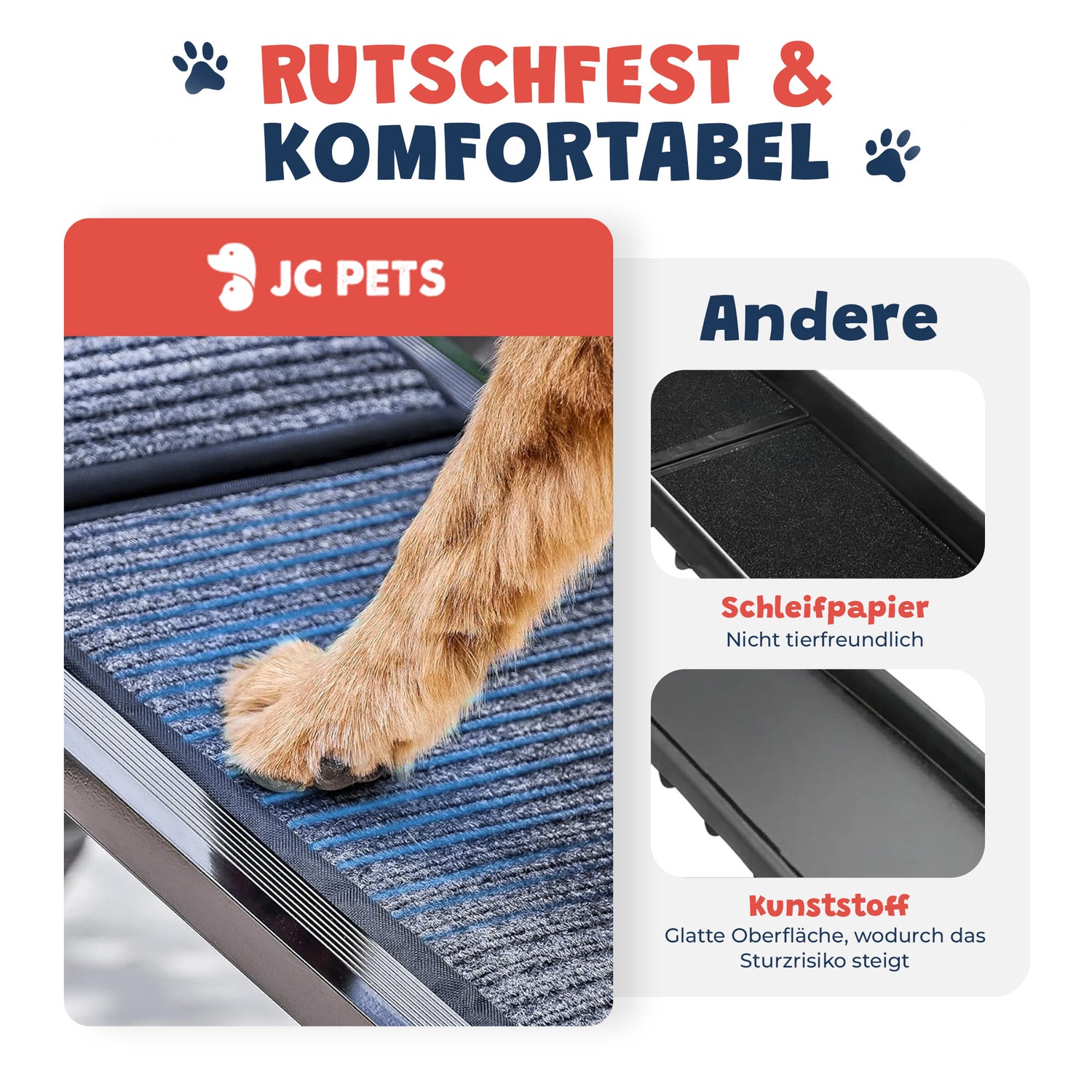 Die Oberfläche der JC Pets Hunderampe ist mit einer strapazierfähigen, teppichähnlichen Antirutsch-Beschichtung versehen, die verhindert, dass dein Hund ausrutscht. Das bietet nicht nur zusätzliche Sicherheit, sondern auch Komfort beim Laufen. Selbst ältere Hunde oder Hunde mit Gelenkproblemen können die Rampe mühelos benutzen.