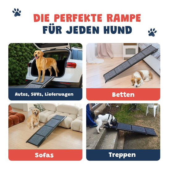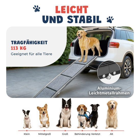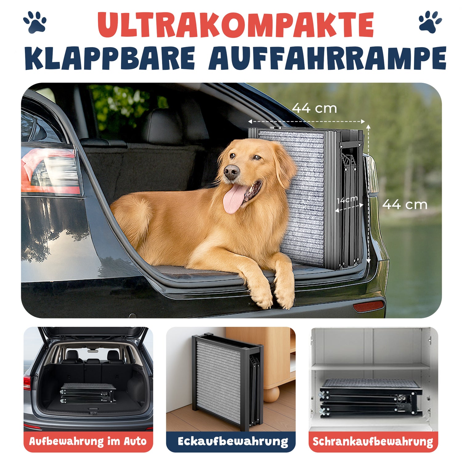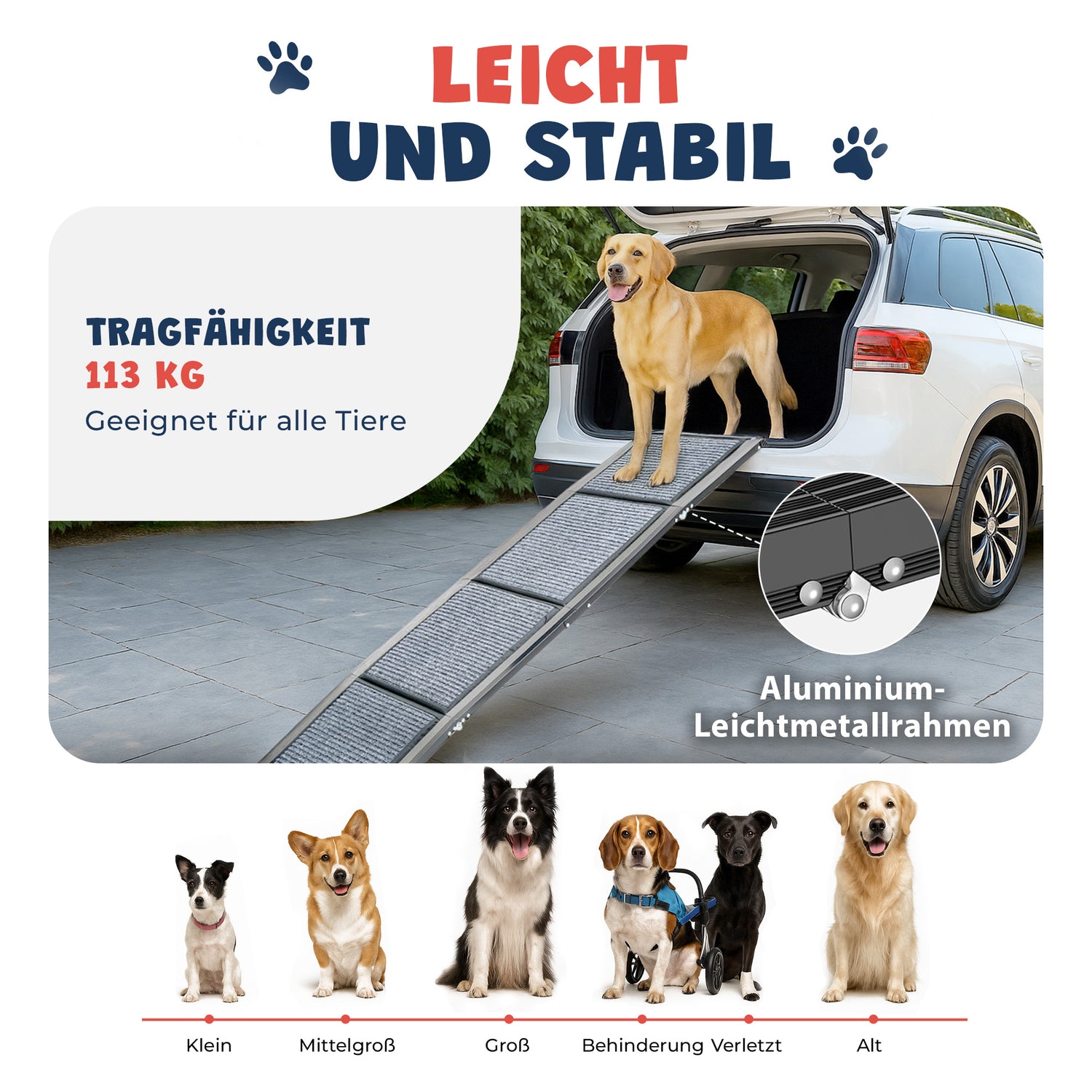 Diese stabile und leichte Rampe wurde speziell entwickelt, um Hunden das Ein- und Aussteigen zu erleichtern und die Gelenke zu entlasten. Ideal für ältere Hunde, Hunde mit Gelenkproblemen oder Welpen, die zusätzliche Unterstützung brauchen.