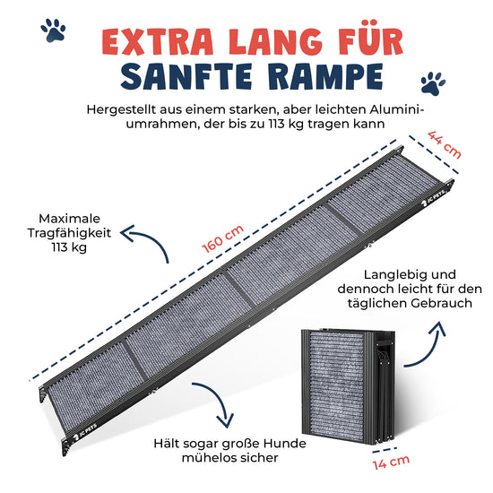 Mit einer Länge von 160 cm bietet die Rampe einen sanften Neigungswinkel, wodurch die Belastung der Gelenke deutlich reduziert wird. Perfekt geeignet für Autos, SUVs, Wohnmobile oder zu Hause bei höheren Stufen.