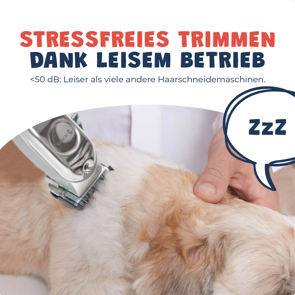 ✓ Arbeitet unter 50 dB und ist somit leiser als viele andere Haarschneidemaschinen. Das hilft deinem Hund, während des Trimmens ruhig und stressfrei zu bleiben.