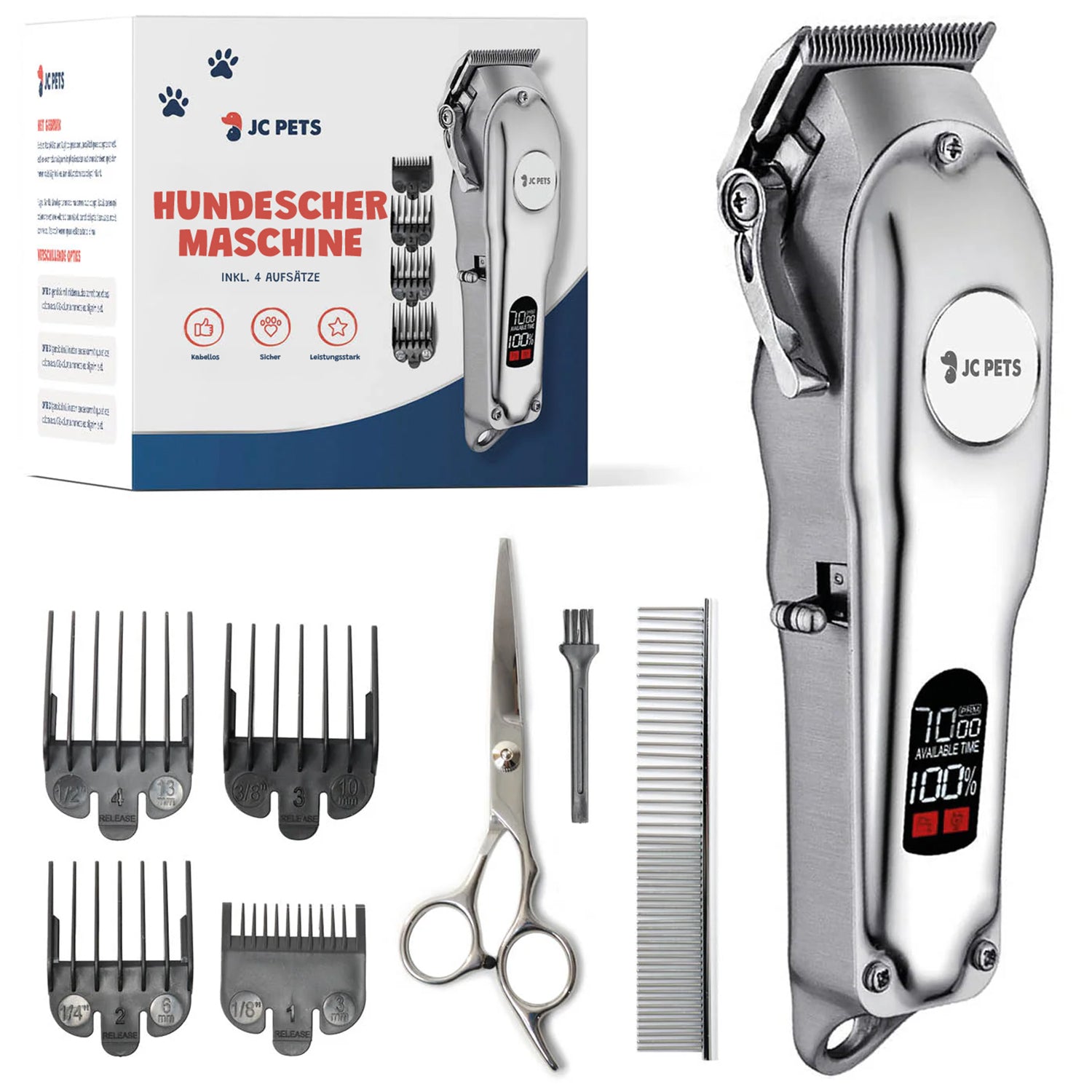 - Lieferumfang: JC Pets Hundehaarschneidemaschine, 4 Aufsatzkämme, Schere, Kamm, Ladegerät, Öl, Reinigungsbürste, Bedienungsanleitung.