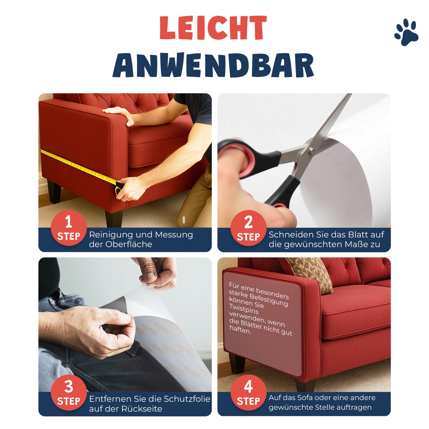Ja, absolut. Die Folien bestehen aus ungiftigem und tierfreundlichem Material mit glatter Oberfläche. Sie sind vollkommen sicher für Katzen und Hunde und verhindern auf freundliche Weise unerwünschtes Kratzverhalten.