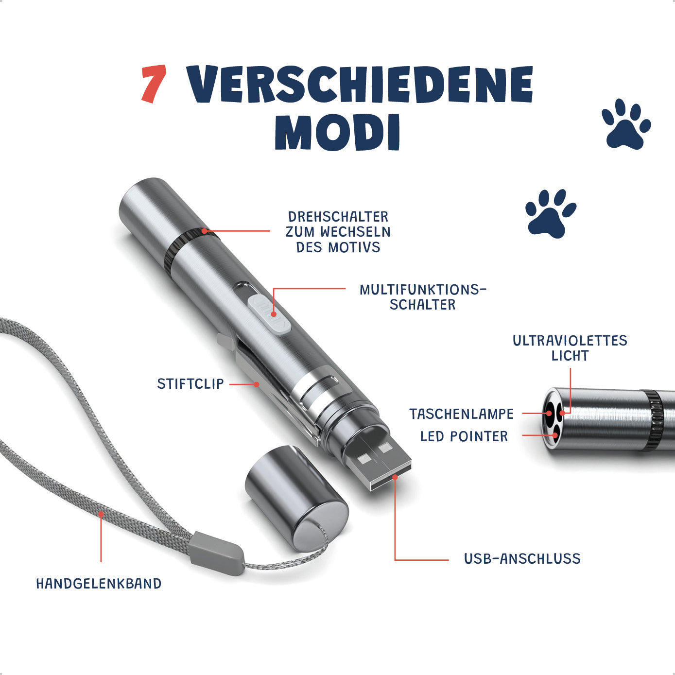 Das ist nämlich das tollste Spielzeug, das es für dein Haustier gibt! Mit diesem Spielzeug erlebst du endlosen Spielspaß, ohne dass es schnell kaputt geht oder neue Batterien benötigt. Der Laserpointer ist nämlich per USB aufladbar. Das bedeutet, dass du einfach das Ladegerät deines Handys benutzen kannst. Der Laserpointer kann eine Entfernung von bis zu 50 Metern erreichen! Außerdem verfügt der Laserpointer über ganze 7 verschiedene Modi, wie ein Smiley oder einen Stern. Du kannst den Laserpointer sogar als Mini-Taschenlampe und als UV-Lampe verwenden.