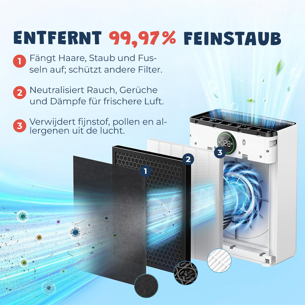 ✔ HEPA-13-Filter – Filtert 99,97 % aller Allergene, Pollen, Bakterien und Feinstaub (PM2.5) aus der Luft.