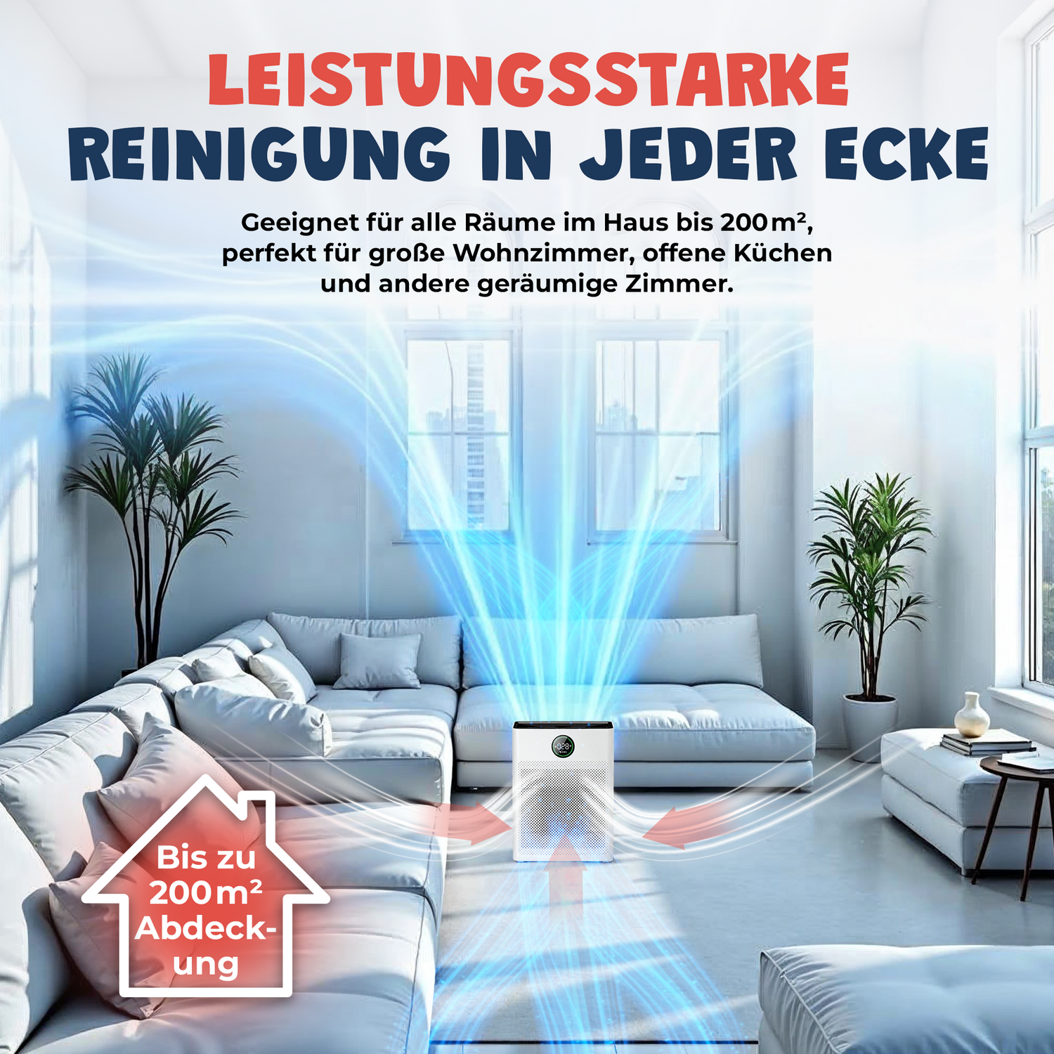 Der Luftreiniger ist für Räume bis zu 100 m² geeignet, zum Beispiel Wohnzimmer, offene Küchen, Schlafzimmer oder Tierbereiche. Dank des hohen CADR-Wertes von 246 m³/h wird die Luft schnell und gründlich gereinigt.