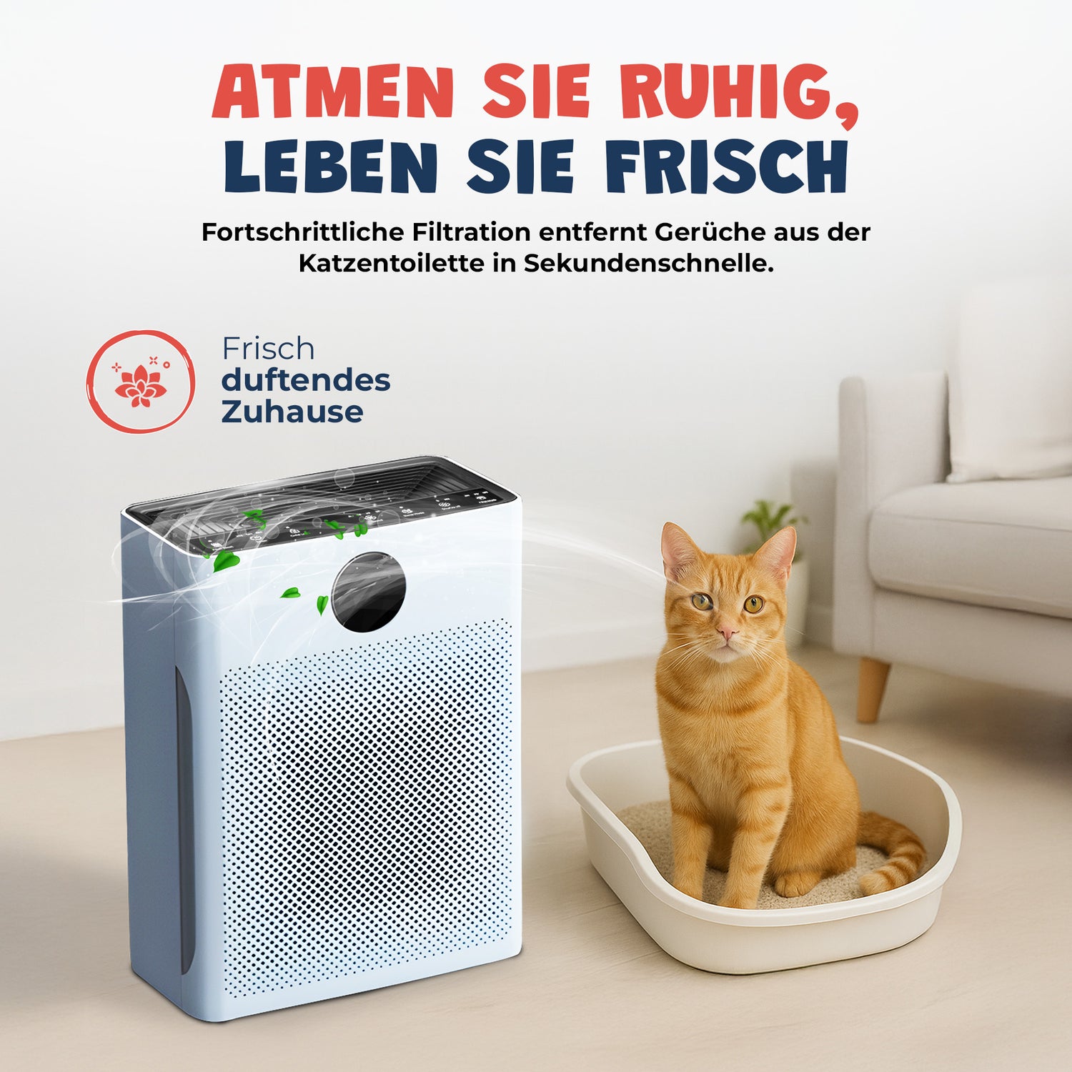 Egal ob frische "Hinterlassenschaft" oder gerade geleertes Katzenklo, dieser Luftreiniger hält die Luft frisch, selbst in Räumen, in denen deine Katze die meiste Zeit verbringt. Ideal für Katzenliebhaber, die ihr Zuhause gerne sauber und frisch halten.
