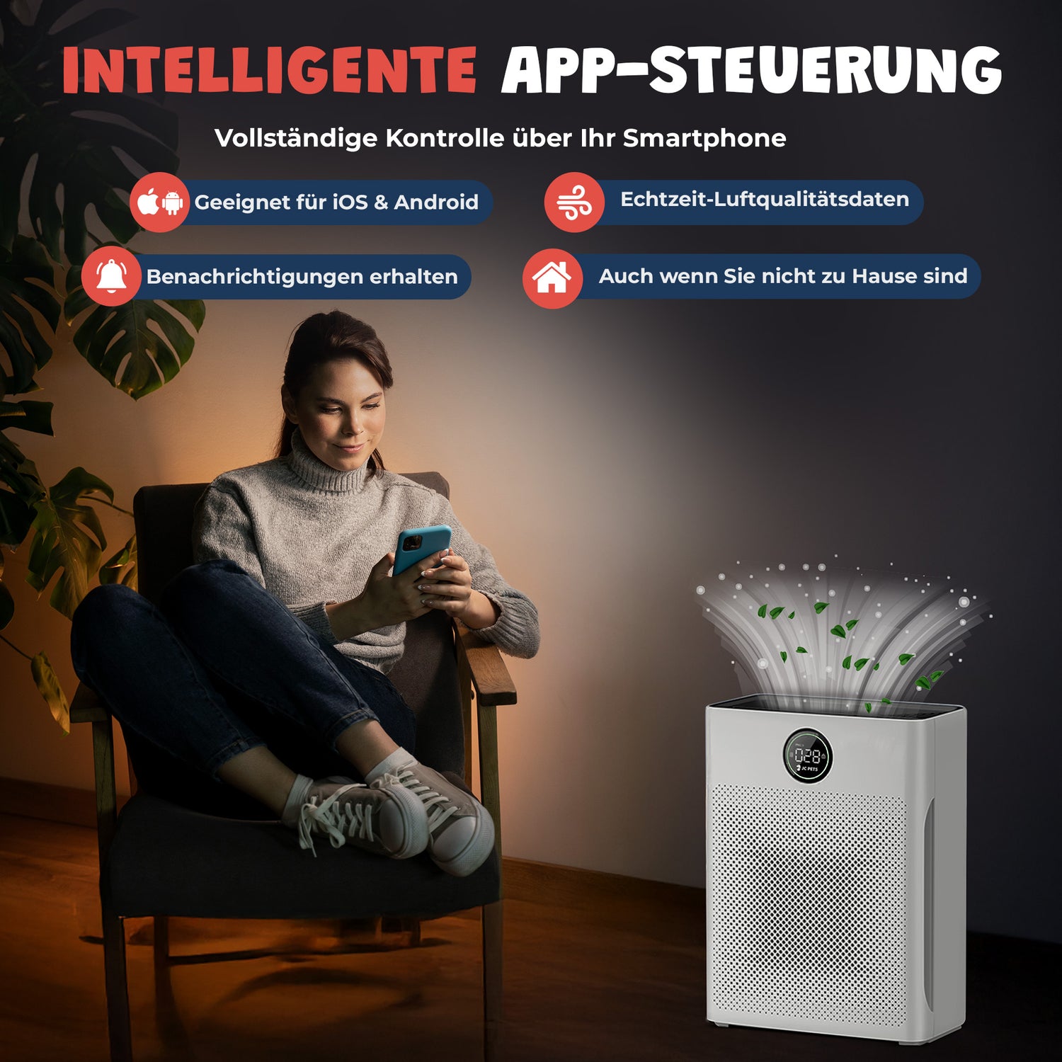 Ja, du kannst den Luftreiniger über eine kostenlose App (iOS und Android) bedienen. Darin siehst du die Luftqualität, stellst Timer ein, aktivierst den Haustiermodus und erhältst Benachrichtigungen zum Filter.