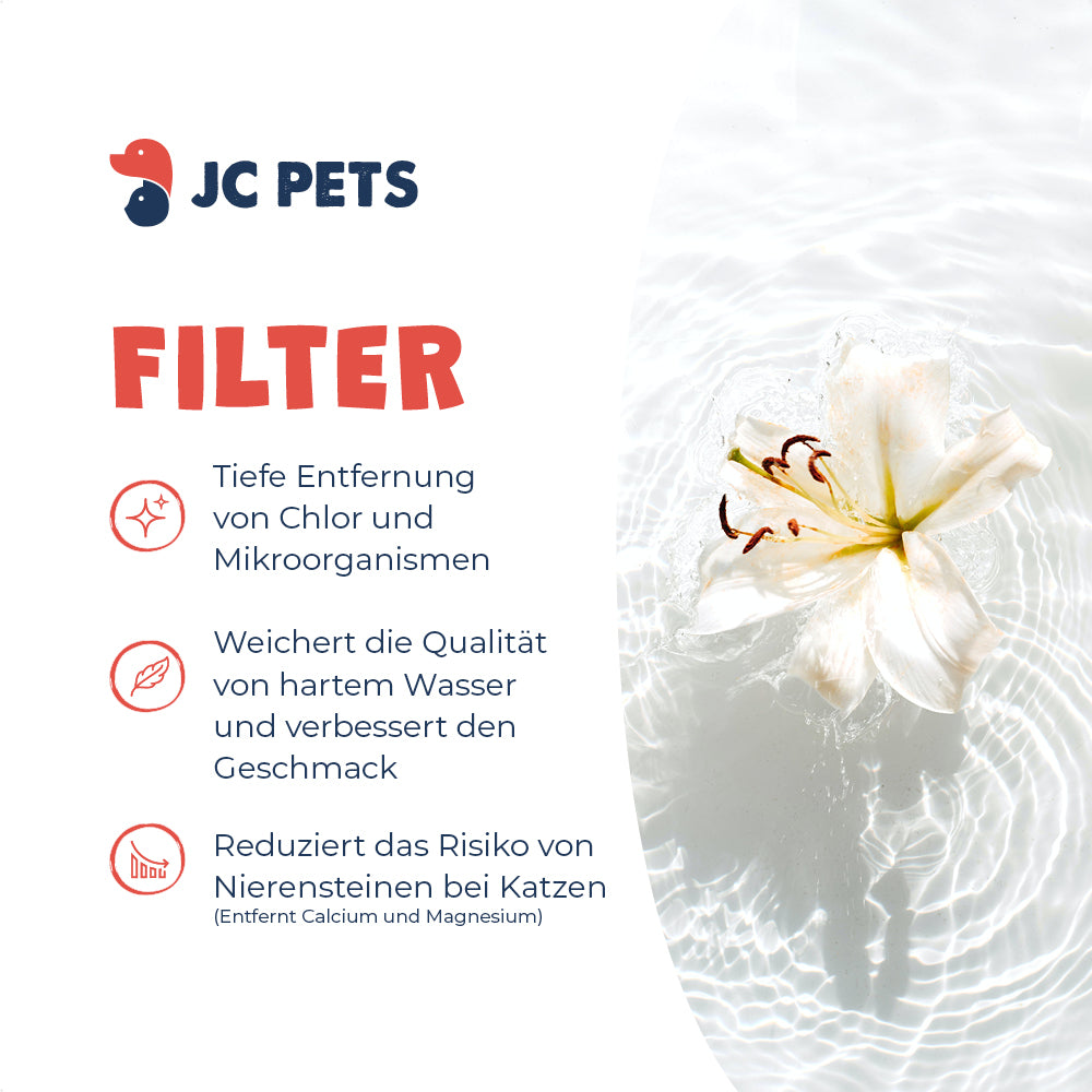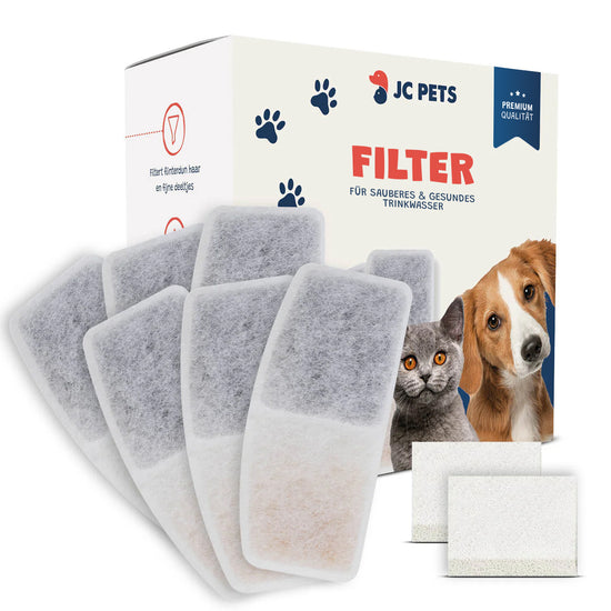 Die JC Pets Trinkbrunnen-Nachfüllpackung besteht aus 6 Premium-Aktivkohlefiltern und 2 Pumpenfiltern. Diese hochwertigen Filter entfernen Schmutz, unangenehme Gerüche und Haare für extra sauberes Trinkwasser. So musst du das Wasser seltener wechseln und gibst deinem Haustier nur das Beste.